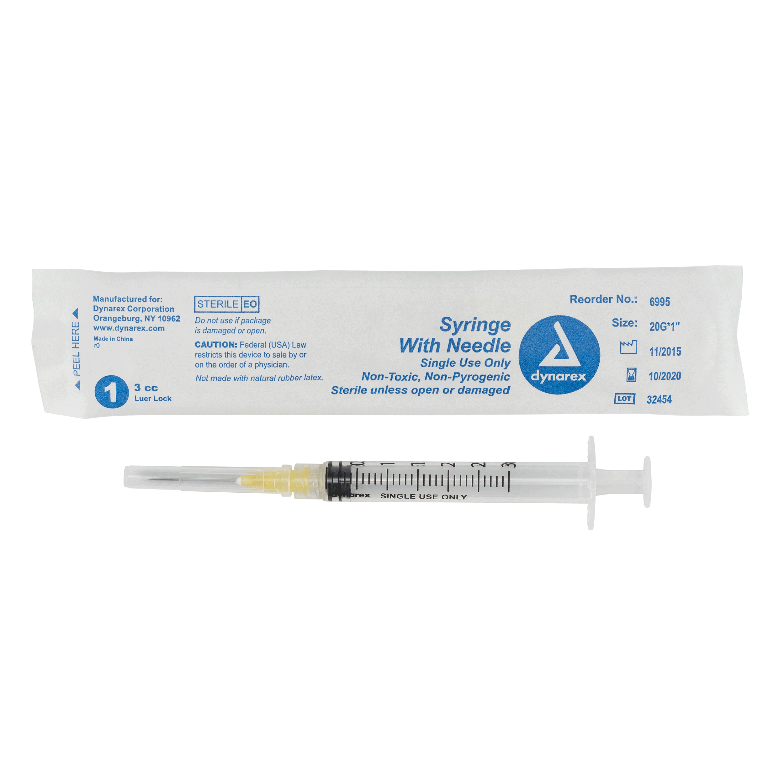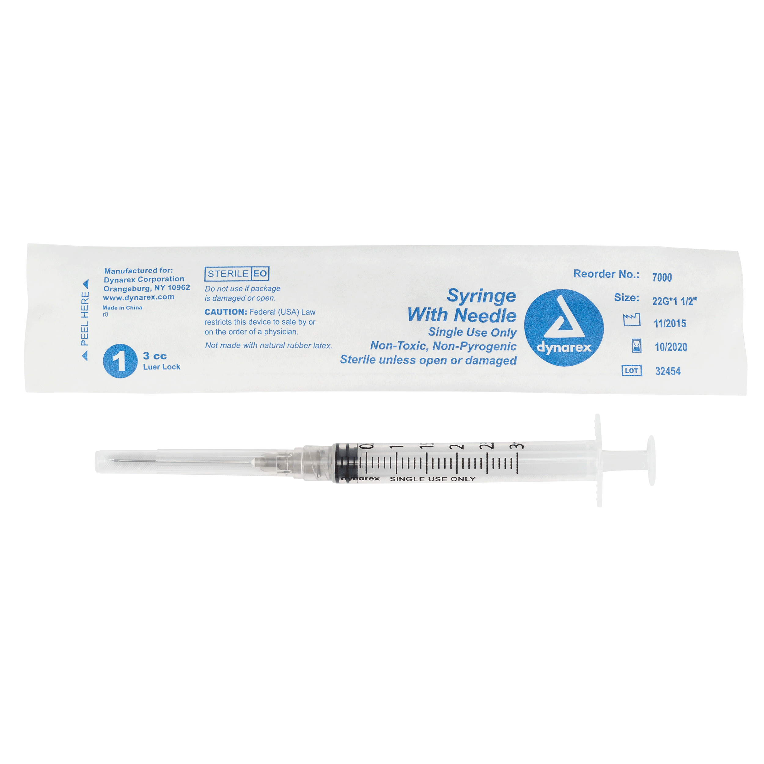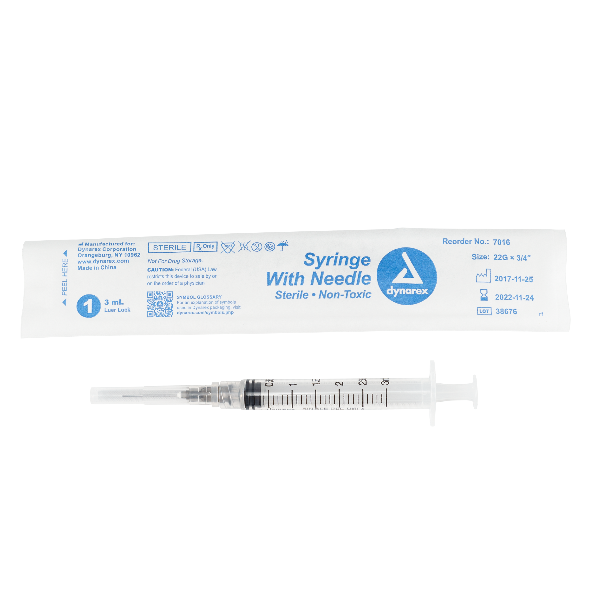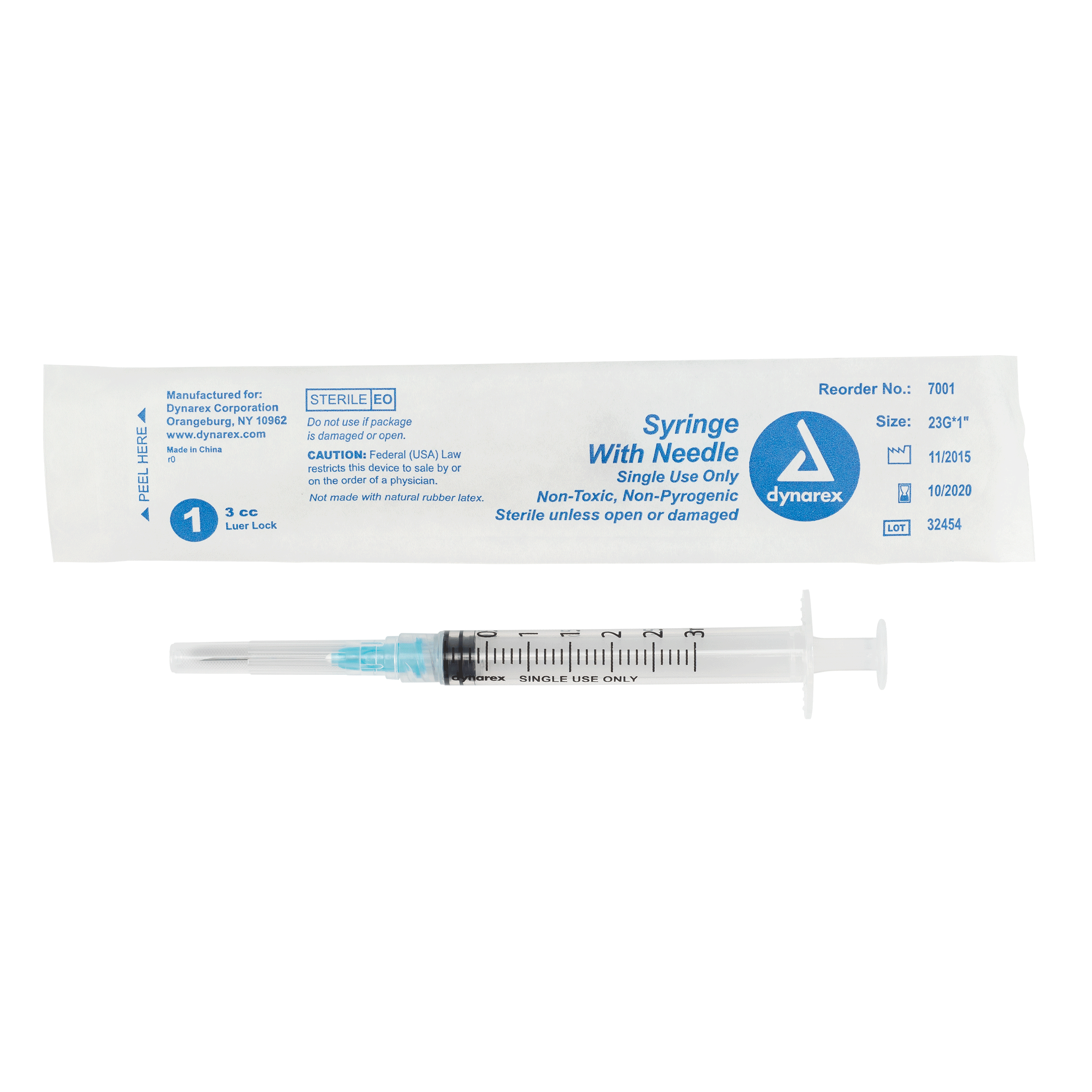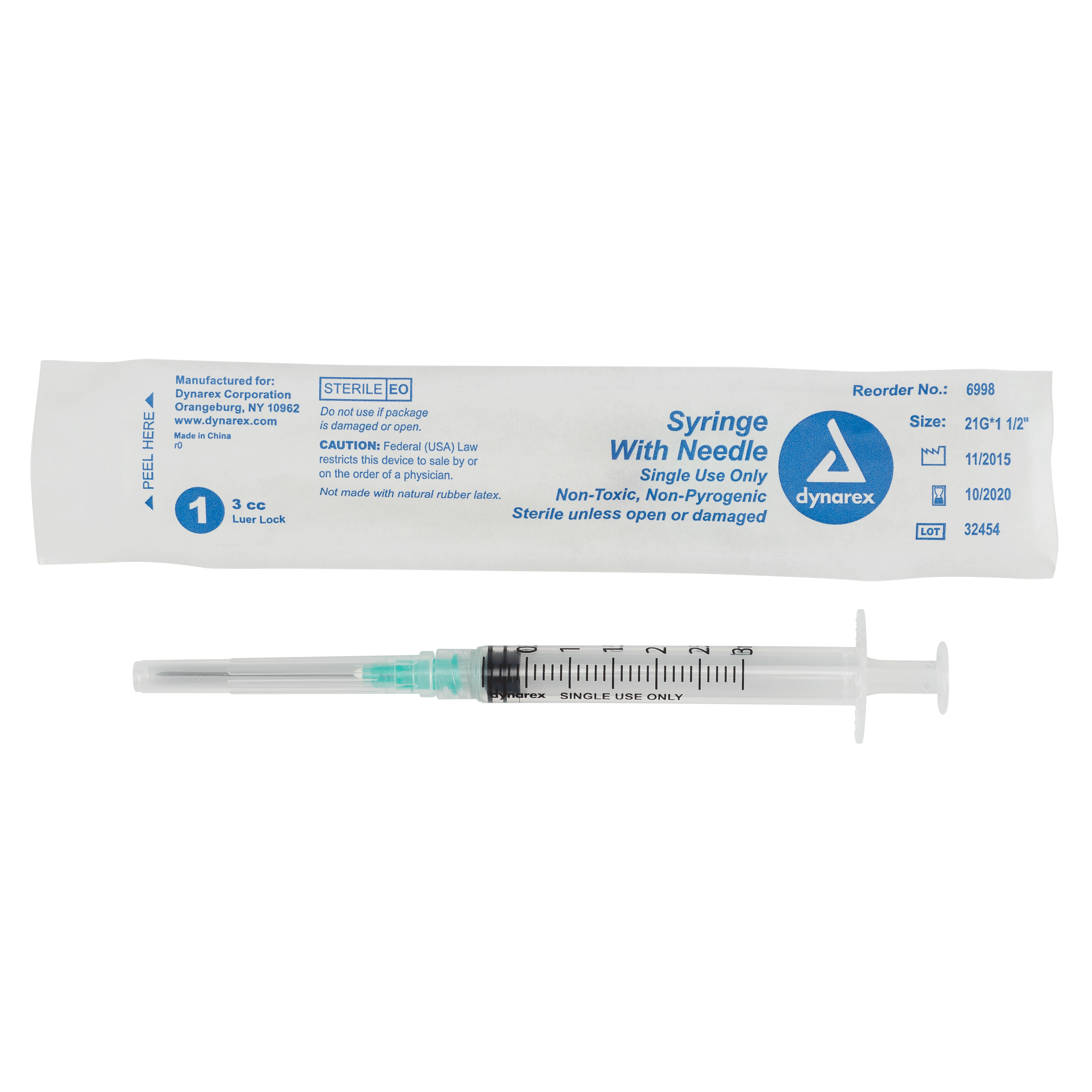 The Dynarex Syringe with Needle features a high-quality, thin-walled needle designed with a double-beveled tip for smooth insertion and added comfort during injections. The transparent polypropylene barrel is clearly marked with bold-font gradations for easy measurement and precise medication dosing.