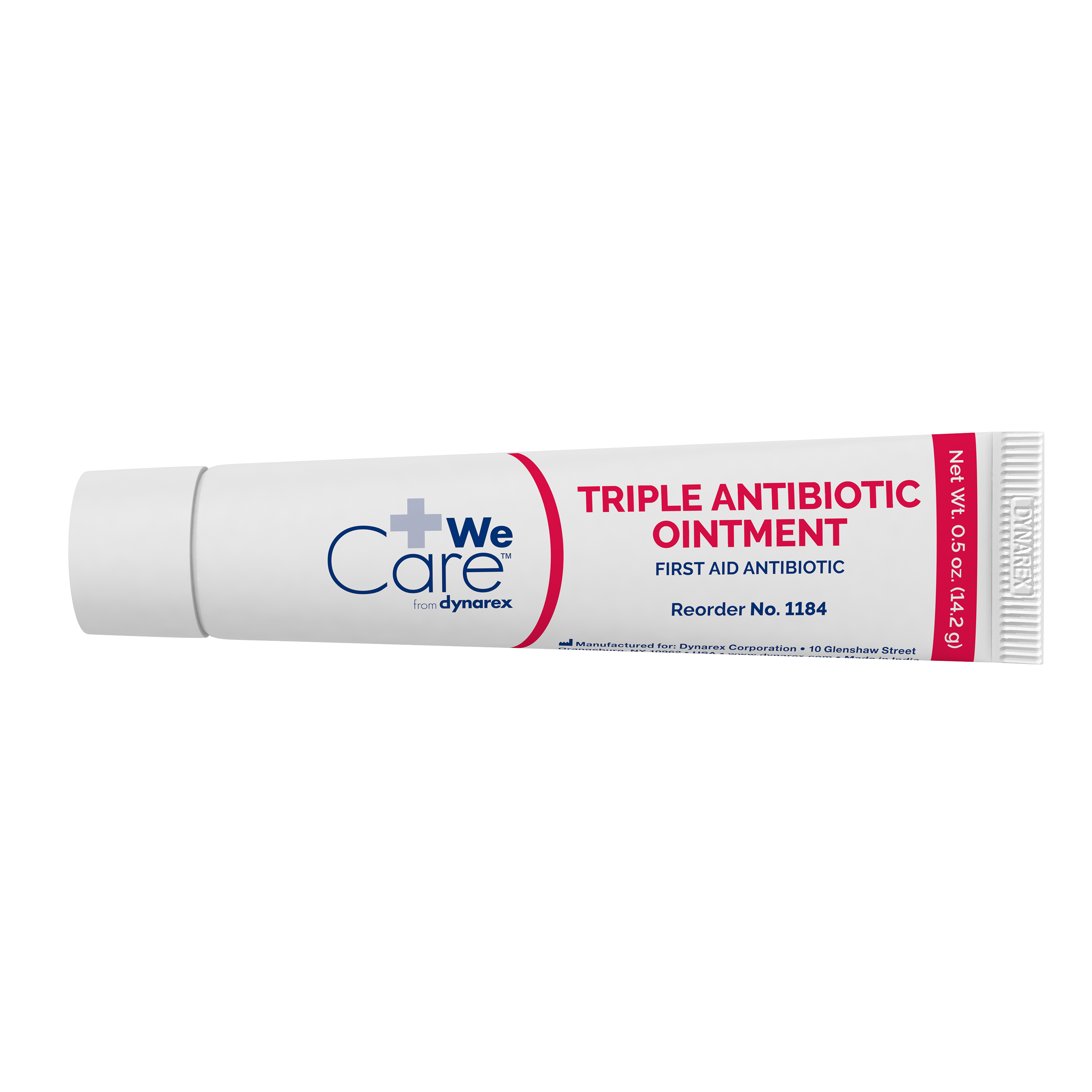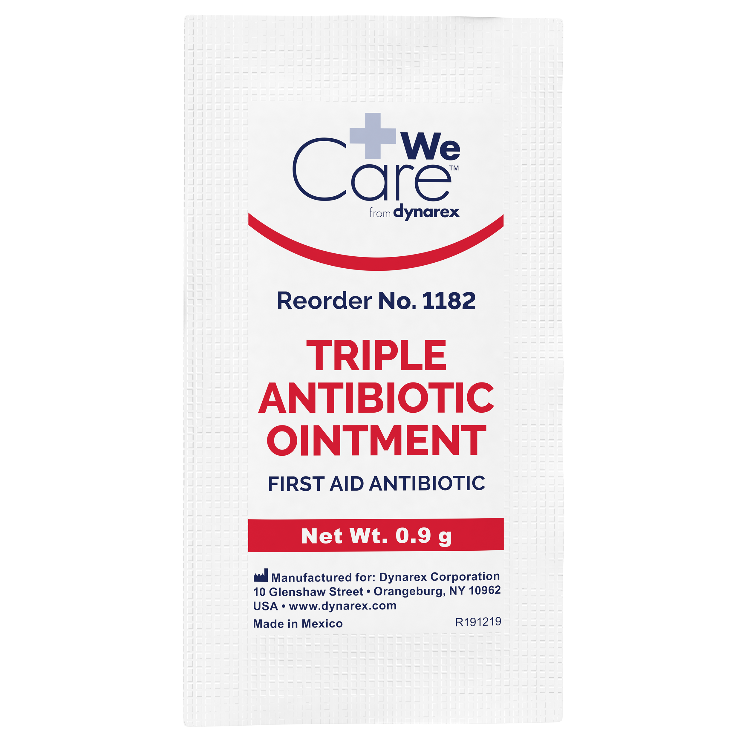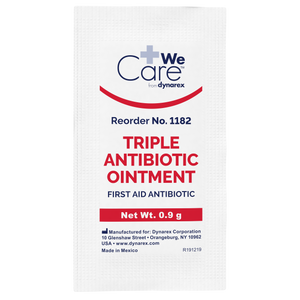 Dynarex DynaSafety Triple Antibiotic Ointment is a topical first-aid treatment formulated to help reduce the risk of infection in minor cuts, scrapes, and burns. The triple-acting formula promotes skin healing and inhibits bacterial growth. Ideal for use in first-aid kits, clinics, long-term care, schools, and homecare settings.